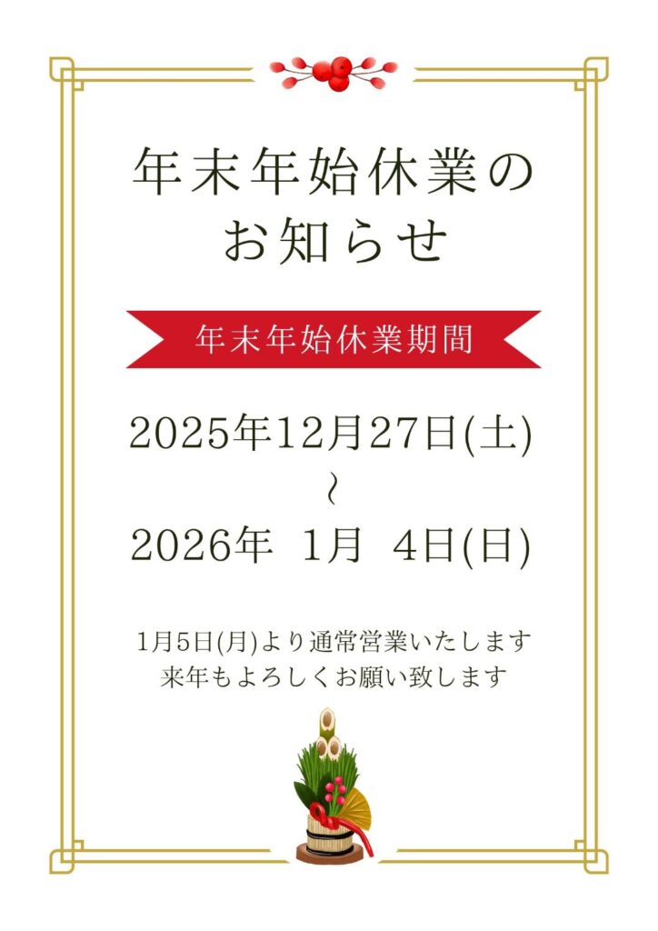 年末年始休業のお知らせ 投稿日 2025年12月18日 著者 koseki_admin カテゴリー お知らせ シェア ツイート LINE 誠に勝手ながら、下記の期間を休業日とさせていただきます。 大変ご迷惑お掛け致しますが、何卒ご理解頂きますようお願い申し上げます。 2025年12月27(土)~2026年1月4(日)